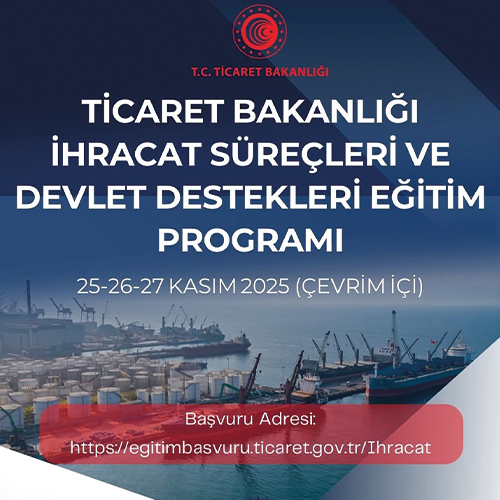 İhracat Süreçleri ve Devlet Destekleri Eğitim Programı Ticaret Bakanlığımızca 25-26-27 Kasım 2025 tarihlerinde “Ticaret Bakanlığı İhracat Süreçleri ve Devlet Destekleri Eğitim Programı”, görselde verilen program akışı kapsamında çevrimiçi olarak gerçekleştirildi.