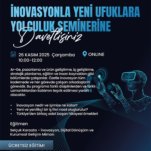 İnovasyonla Yeni Ufuklara Yolculuk Semineri Araştırma-geliştirmeden pazarlamaya, stratejik planlamadan insan kaynaklarına kadar tüm alanlarda inovatif düşünme becerilerini geliştirmek üzere düzenlenen seminerimiz tamamlandı!