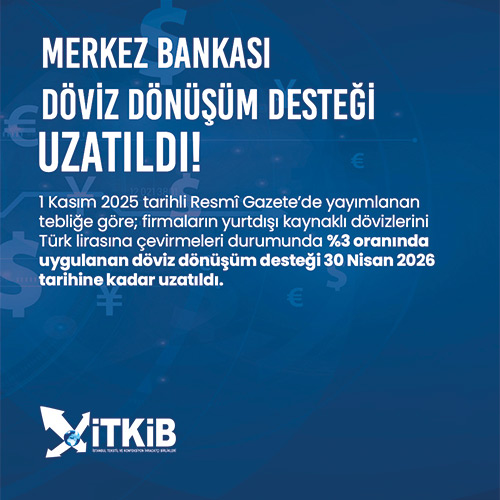1 Kasım 2025 tarihli Resmî Gazete’de yayımlanan tebliğe göre; firmaların yurtdışı kaynaklı dövizlerini Türk lirasına çevirmeleri durumunda %3 oranında uygulanan döviz dönüşüm desteği 30 Nisan 2026 tarihine kadar uzatıldı. |