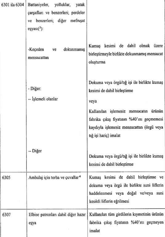 - Sütun 3’te belirtilen şartlar, ürünün imalatında kullanılan, temel dokumaya elverişli maddelerin toplam ağırlığının hep birlikte %15 veya daha azını oluşturan temel dokumaya elverişli maddelere uygulanmaz. Ama bu tolerans yalnızca iki veya daha fazla temel dokumaya elverişli maddeden yapılmış karışık ürünlere uygulanabilir.