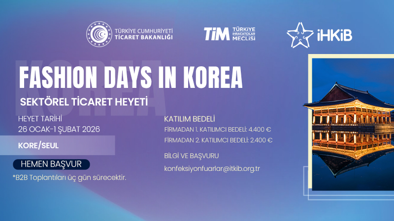 5973 Sayılı Cumhurbaşkanı Kararı ile yürürlüğe konulan İhracat Destekleri Hakkında Karar kapsamında, 26 Ocak - 1 Şubat 2026 tarihlerinde Güney Kore’nin Seul kentinde hazır giyim, deri konfeksiyon, ayakkabı, çanta üreticilerine yönelik Güney Koreli İthalatçı firmaları hedefleyen B2B görüşmeleri planlanmaktadır.