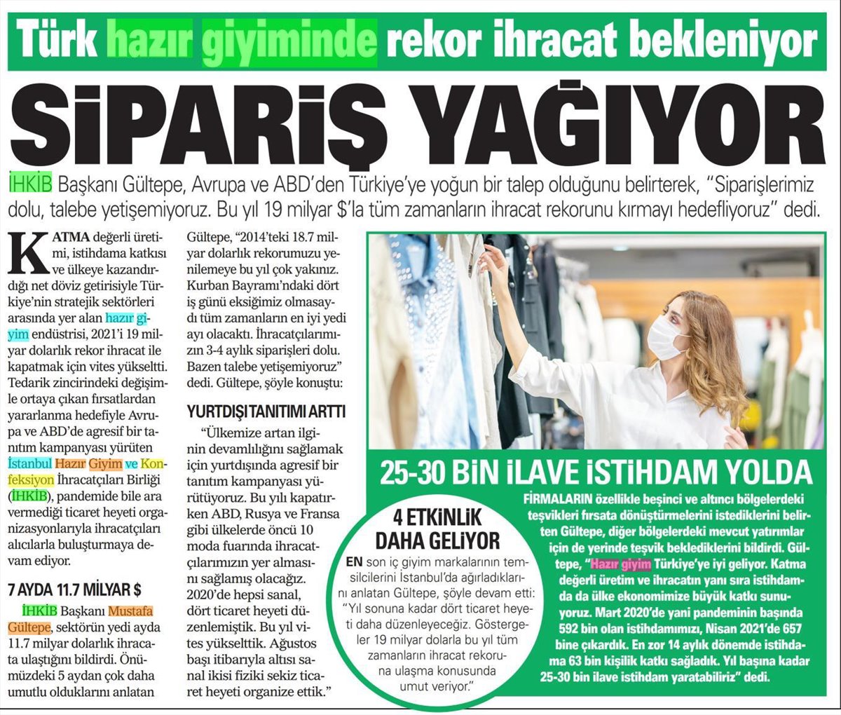 Katma değerli üretimi, istihdama katkısı ve ülkeye kazandırdığı net döviz getirisiyle Türkiye'nin stratejik sektörleri arasında yer alan hazır giyim endüstrisi, 2021'i 19 milyar dolarlık rekor ihracat ile kapatmak için vites yükseltti. Tedarik zincirindeki değişimle ortaya çıkan fırsatlardan yararlanma hedefiyle Avrupa ve ABD'de agresif bir tanıtım kampanyası yürüten İstanbul Hazır Giyim ve Konfeksiyon İhracatçıları Birliği (İHKİB), pandemide bile ara vermediği ticaret heyeti organizasyonlarıyla ihracatçıları alıcılarla buluşturmaya devam ediyor.