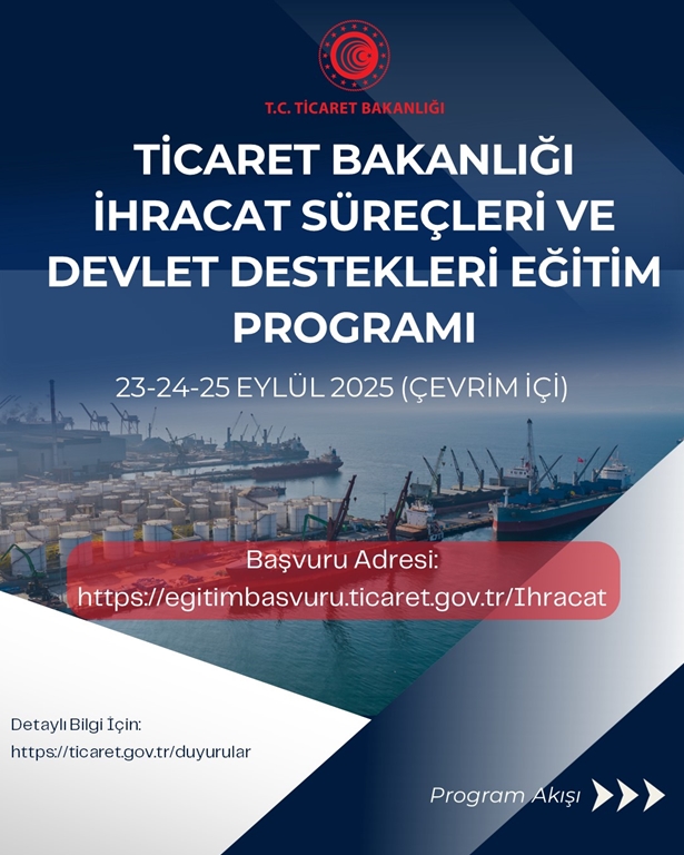 Bu çerçevede, Ticaret Bakanlığı’ndan alınan bir yazıda, Türkiye’deki tüm iş çevrelerinin genel katılımına açık olarak EK-2’de yer alan program akışı çerçevesinde 23-24-25 Eylül 2025 tarihlerinde çevrim içi bir eğitim programının gerçekleştirileceği ve eğitimin en az üçte ikilik kısmına katılım sağlayan katılımcılar adına eğitim programı sonunda dijital katılım belgesi düzenleneceği bildirilmektedir.