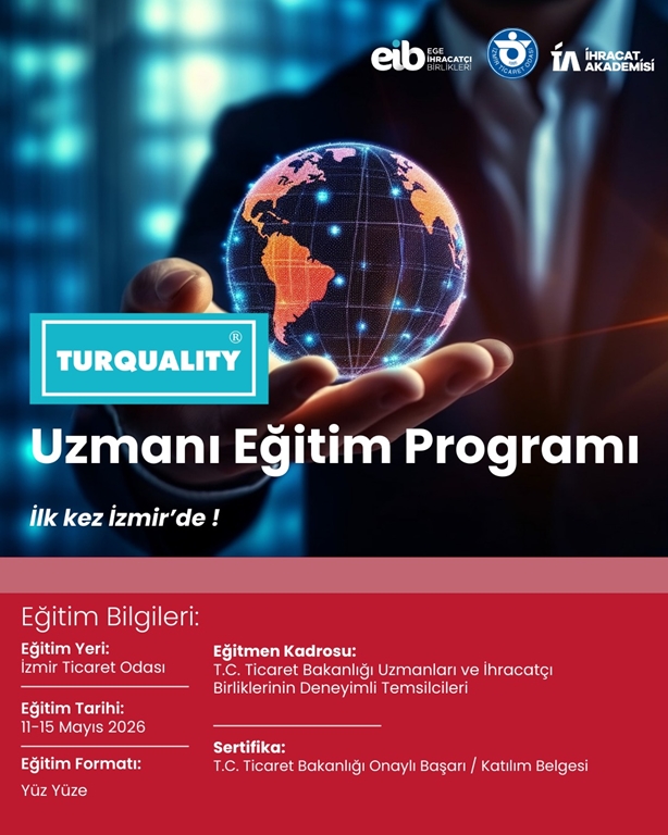 Bu çerçevede, Bakanlık koordinasyonunda İhracat Akademisi çatısı altında 11–15 Mayıs tarihlerinde TURQUALITY® Uzmanı Eğitimi’nin İzmir Ticaret Odası'nda gerçekleştirilmesinin planlandığı aktarılmaktadır.