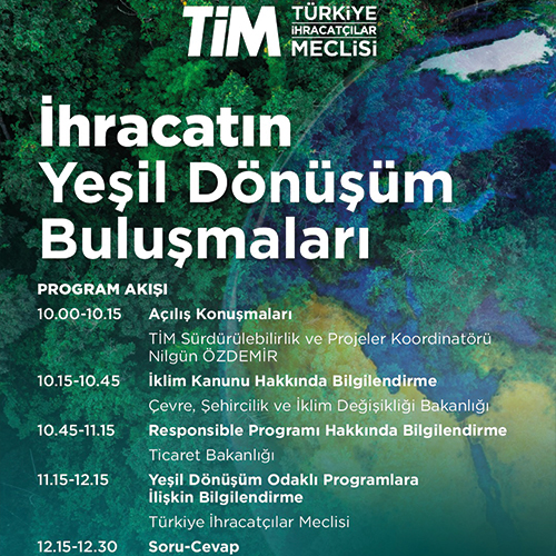 İhracatın Yeşil Dönüşüm Buluşmaları Webinarı Tamamlandı “İhracatın Yeşil Dönüşüm Buluşmaları” etkinliği gerçekleştirildi.