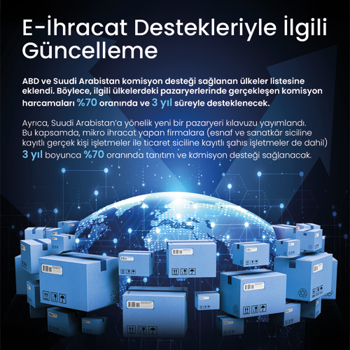 E-ihracat Destekleriyle İlgili Güncelleme ABD ve Suudi Arabistan komisyon desteği sağlanan ülkeler listesine eklendi. Böylece, ilgili ülkelerdeki pazaryerlerinde gerçekleşen komisyon harcamaları %70 oranında ve 3 yıl süreyle desteklenecek. |