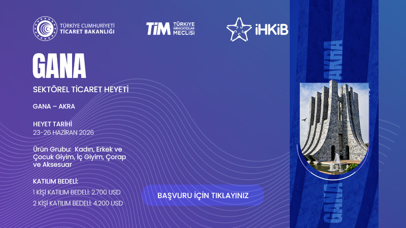 5973 Sayılı Cumhurbaşkanı Kararı ile yürürlüğe konulan İhracat Destekleri Hakkında Karar kapsamında, 23 – 26 Haziran 2026 tarihlerinde Gana’nın Akra şehrinde kadın, erkek ve çocuk hazır giyim alanındaki ihracatçı firmalarımıza yönelik Gana İthalatçı firmaları hedefleyen B2B görüşmeleri planlanmaktadır.